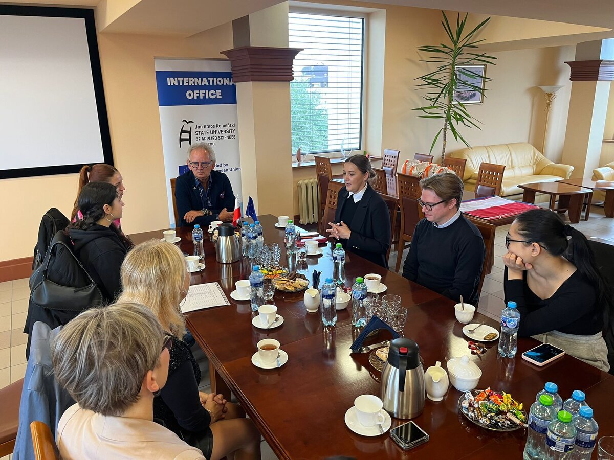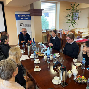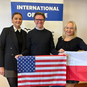 During his first days in Leszno, Dylan took part in a welcome meeting with Vice-Rector Prof. Maciej Pietrzak, PhD, during which his teaching plans and opportunities for collaboration with academic staff and students were discussed. The meeting was also attended by Fulbright mentor – Edyta Mróz, MA, Head of the International Office – Dominika Pluta, MA, and staff members Regina Angelstein, MA and Daria Bródka, MA.