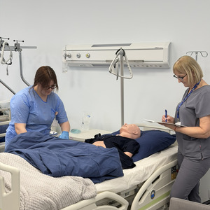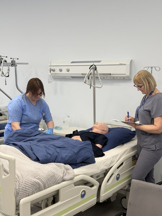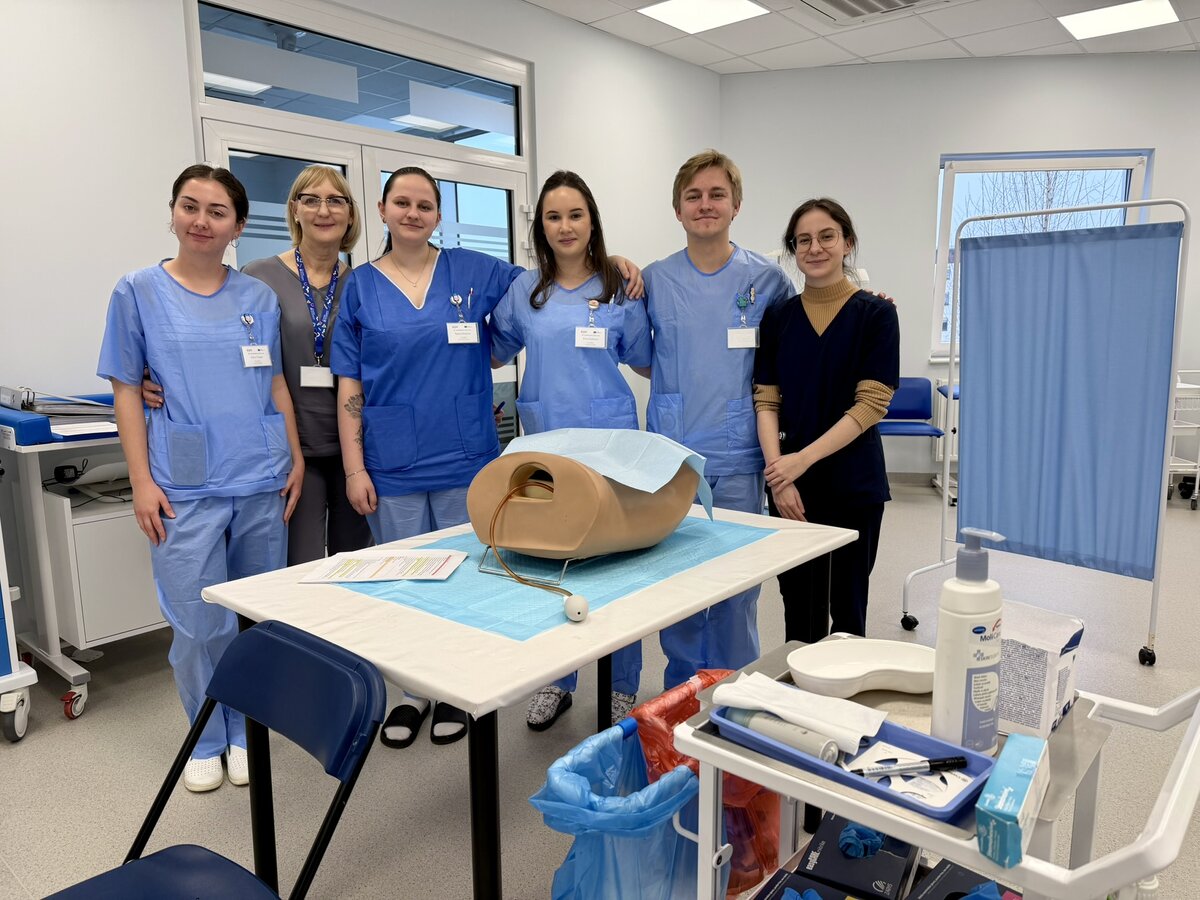The following days were filled with intensive practical classes conducted in four rotating groups. Participants improved nursing procedures using the four-step method, placing particular emphasis on patient safety and the correctness of performed activities during classes led by Ms Paulina Kasztelan, “Learning nursing care procedures using the four-step method,” which also included a newborn bathing simulation. Sessions on methods of preventing and alleviating patient discomfort, “Methods and ways of preventing and combating patient discomfort used by nurses,” were conducted by Ms Dorota Zalisz and Dr Luiza Mendyka. During these classes, participants carried out simulations of positioning a patient on the healthy and affected side, refining correct positioning techniques.